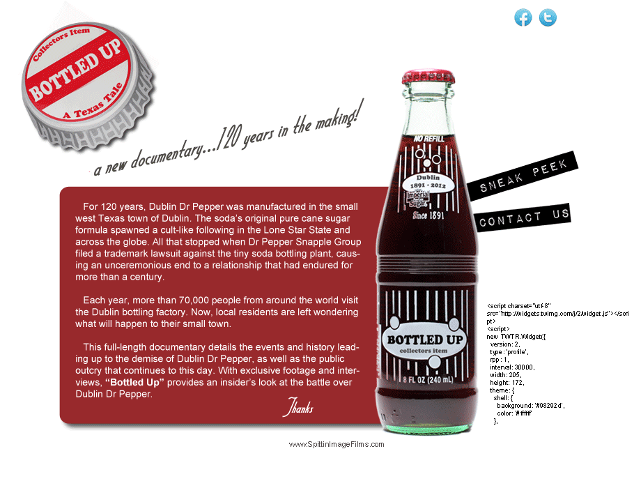 This full-length documentary details the events and history leading up to the demise of Dublin Dr Pepper, as well as the public outcry that continues to this day. With exclusive footage and interviews, “Bottled Up” provides an insider’s look at the battle over Dublin Dr Pepper.